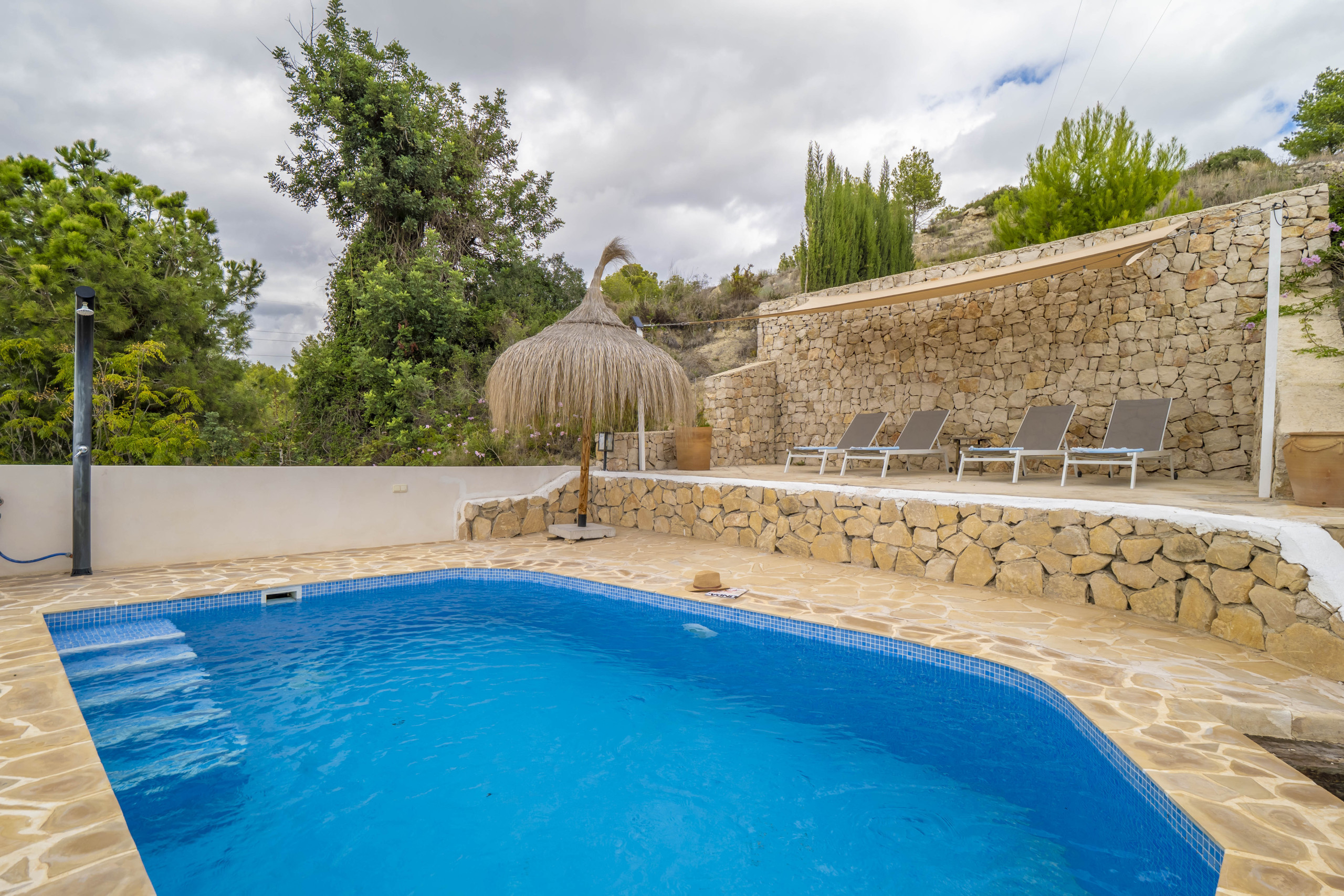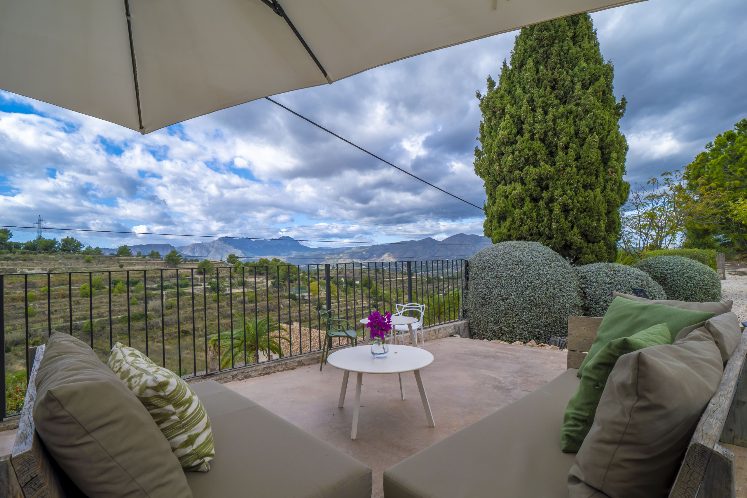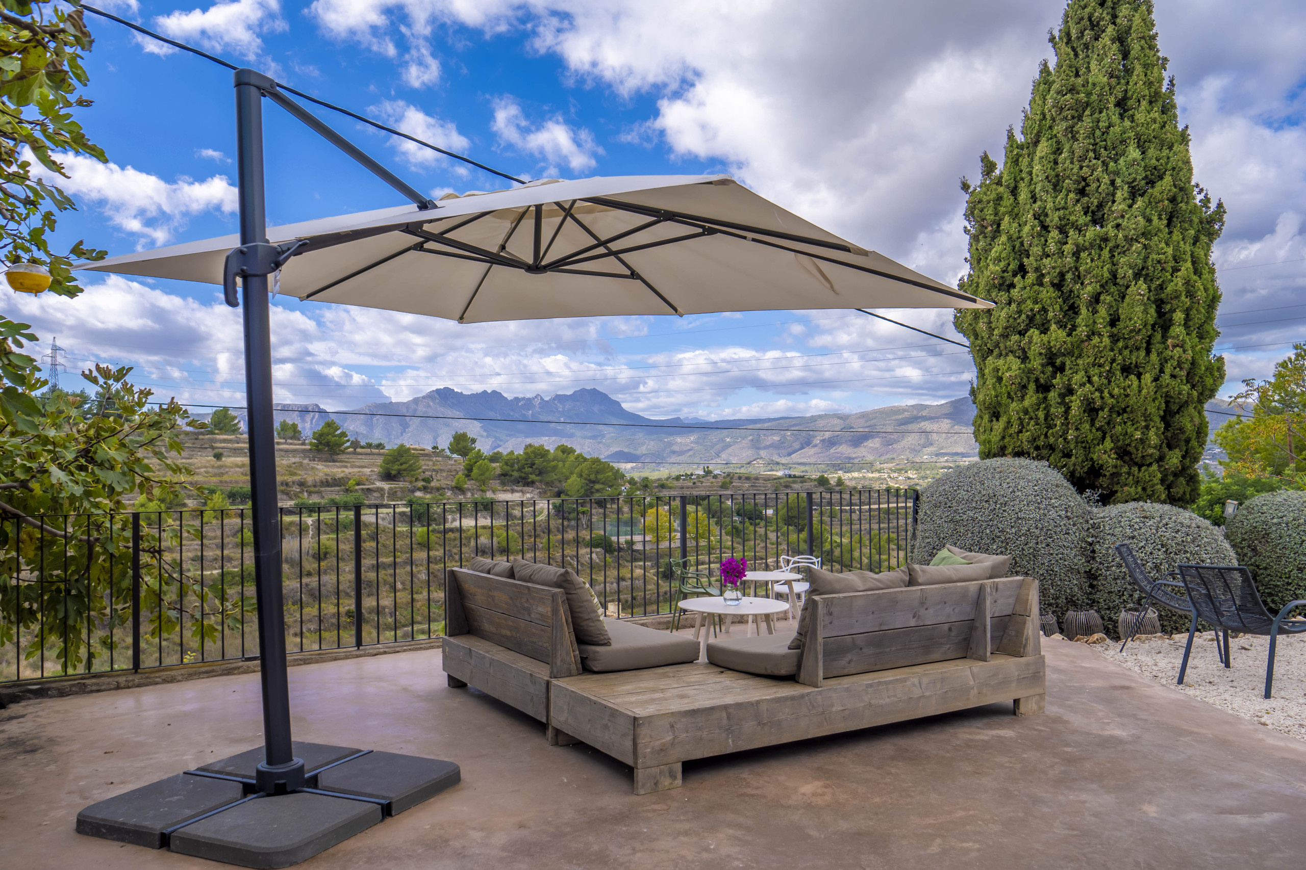 Het buitenleven van Finca Elodie is echt fenomenaal. Finca Elodie is gelegen op circa 200 m van een doorgaande weg in een prachtige omgeving. Vanaf de terrassen heb je geweldig uitzicht op de groene vallei en de Middellandse Zee. Finca Elodie heeft een mooi aangelegde tuin die is voorzien van een privézwembad met rondom lekkere ligbedden waar je kunt genieten van de spaanse zon. Je hebt diverse plekken om te zitten of te loungen. Er is een mooi terras aanwezig met een grote eettafel en ingebouwde barbecue waar je kunt genieten van de warme zomeravonden.