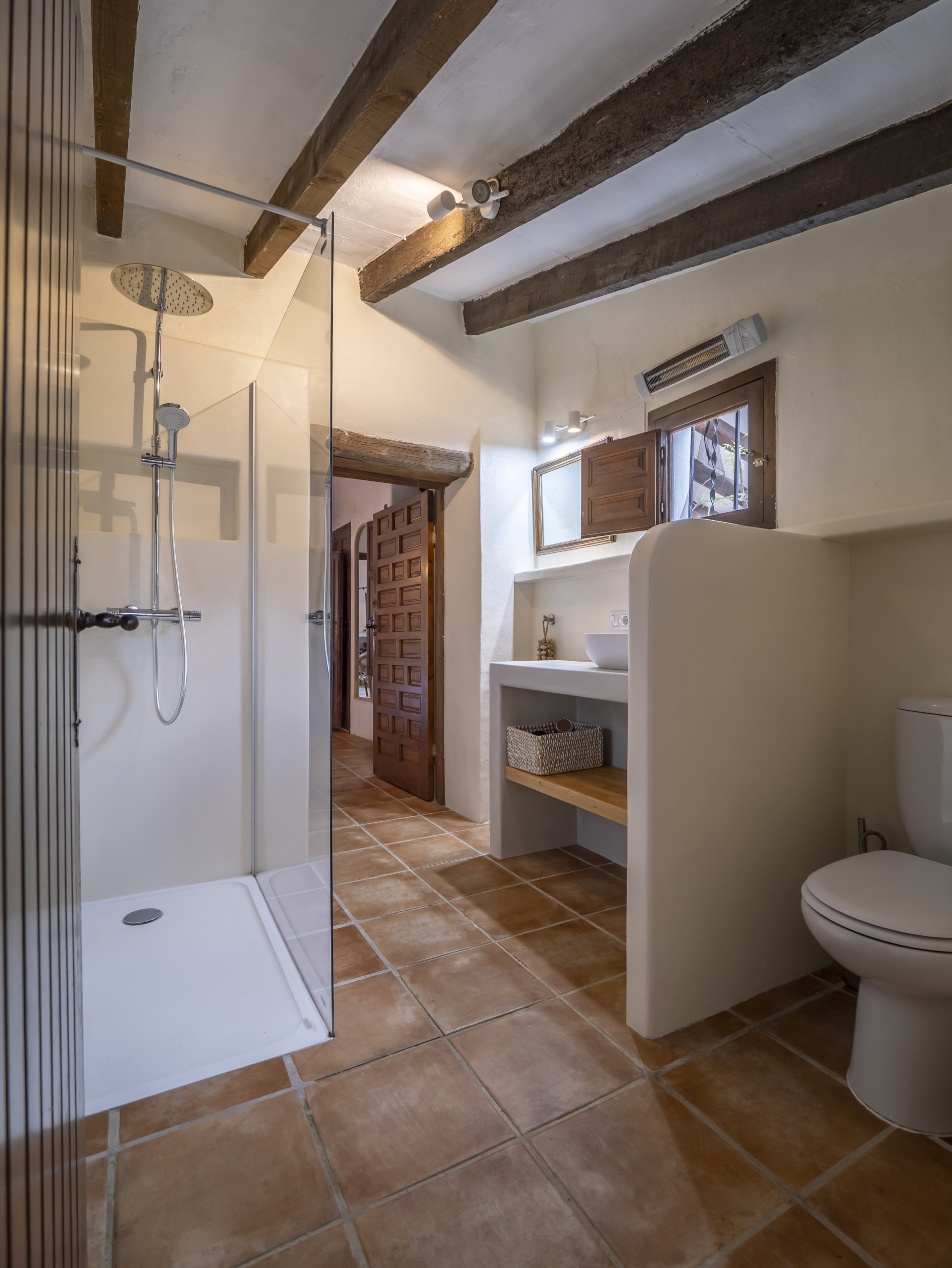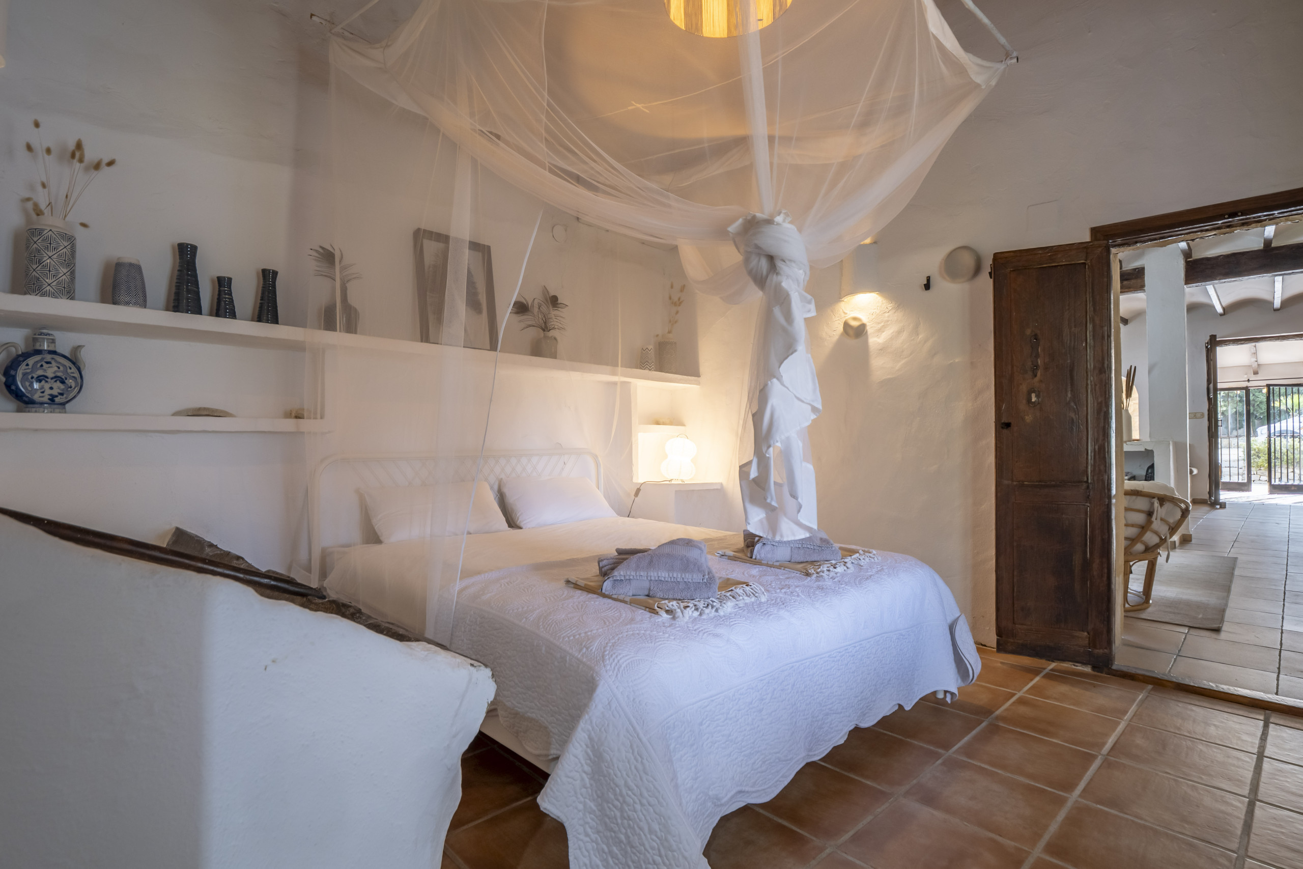 Finca Elodie bestaat uit 2 verdiepingen. Op de begane grond bevinden zich twee woonkamers, een keuken, twee slaapkamers en twee badkamers. De eerste woonkamer is met smaak ingericht met onder andere een zithoek en een kantoorruimte. De tweede woonkamer is voorzien van een houtkachel, televisie met chromecast en een ruime eethoek waar je met 8 personen kunt eten. De keuken is compleet ingericht en o.a. voorzien van vaatwasmachine, koelvries combinatie, oven, magnetron, 5-pits kookplaat en Nespresso koffiezetapparaat en voldoende keukengerei. Slaapkamer 1 is voorzien van een 2-persoonsbed (160x200) en heeft toegang tot het terras. Slaapkamer 2 is voorzien van een 2-persoonsbed (160x200) en heeft ook directe toegang tot het terras. De badkamers op de begane grond zijn beide voorzien van een douche, wastafel en toilet.