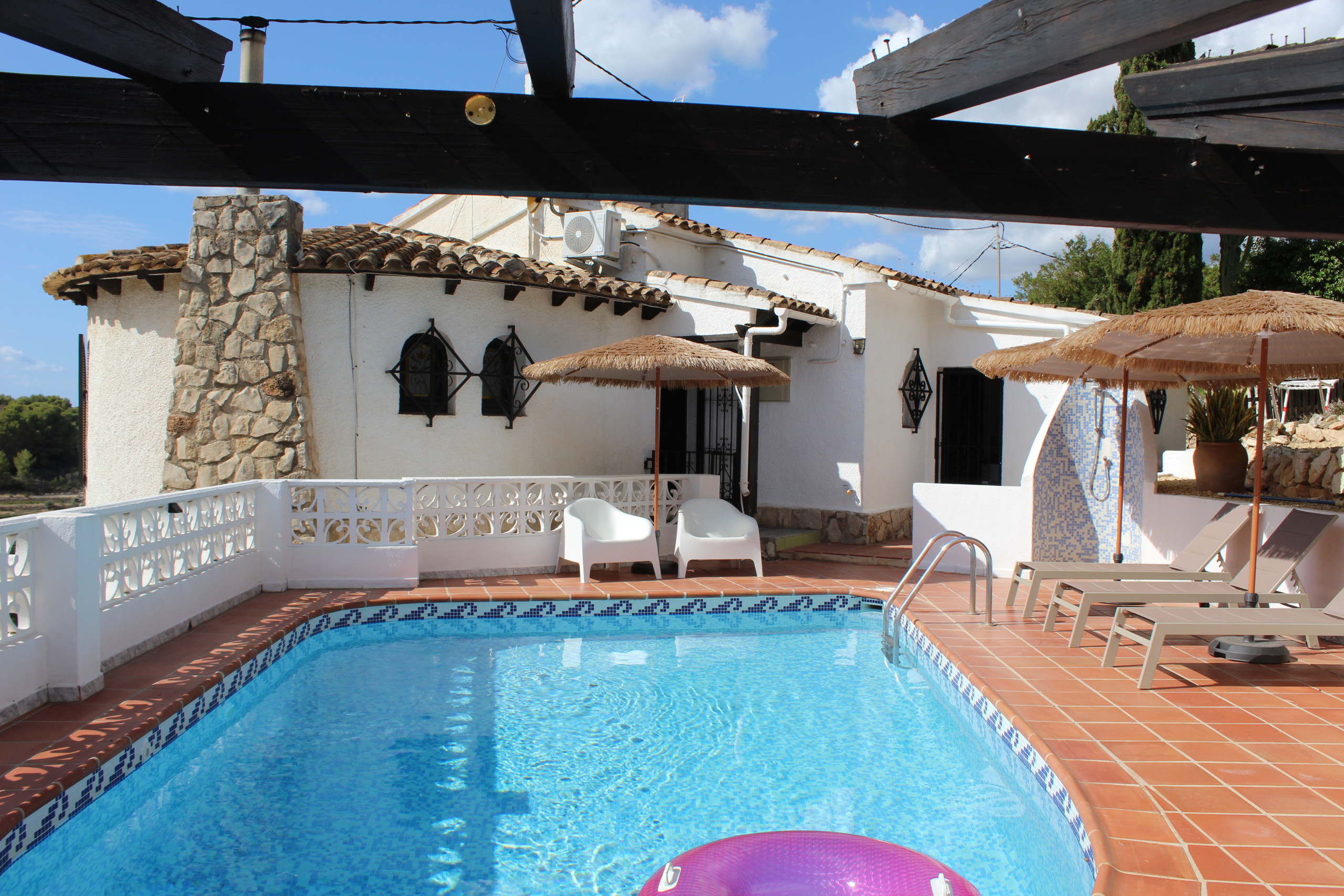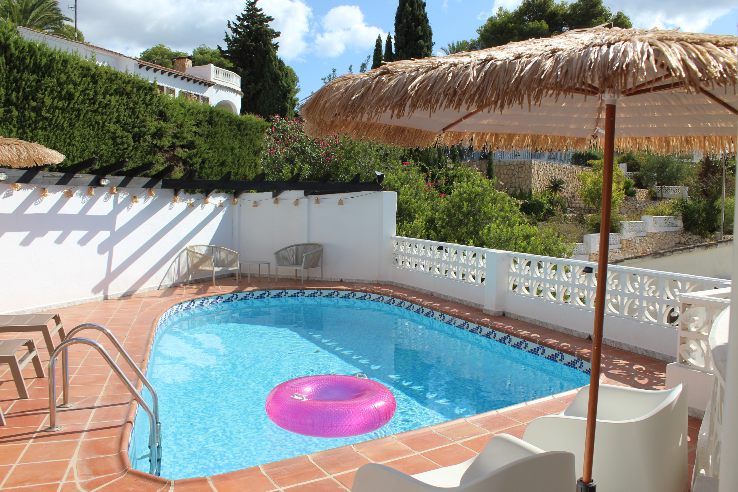 Vanaf de woonkamer kom je buiten bij het heerlijke zwembad van 7 x 4 meter met 4 ligbedden, buitendouche, parasols, en twee zitjes. Het zwembad biedt veel privacy en een prachtig uitzicht op de omgeving en de zee.