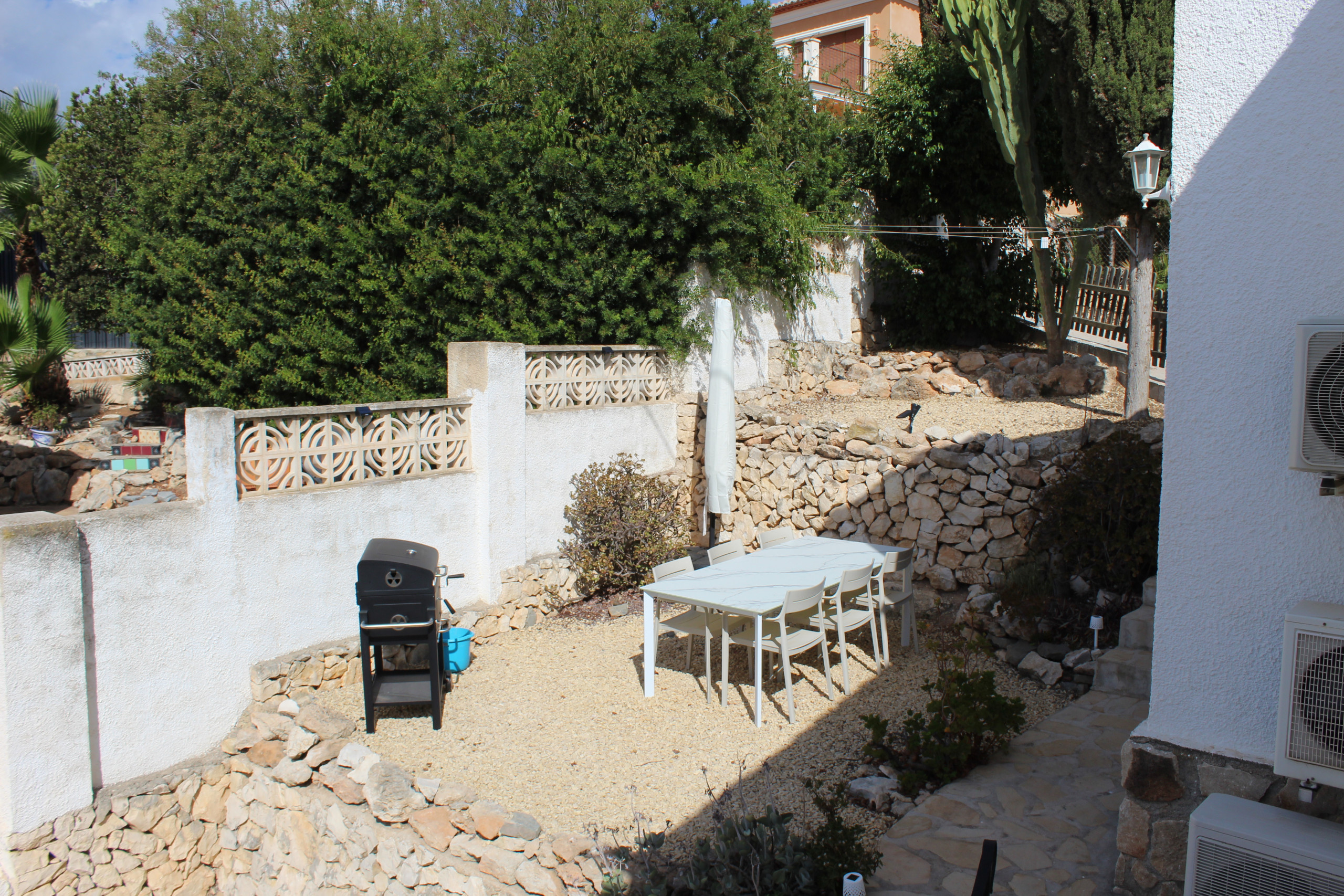 Naast de villa, via een paar treden, is een terras met een grote eettafel voor 6 personen en een barbecue op kolen. Een heerlijke plek voor uren gezellig tafelen.