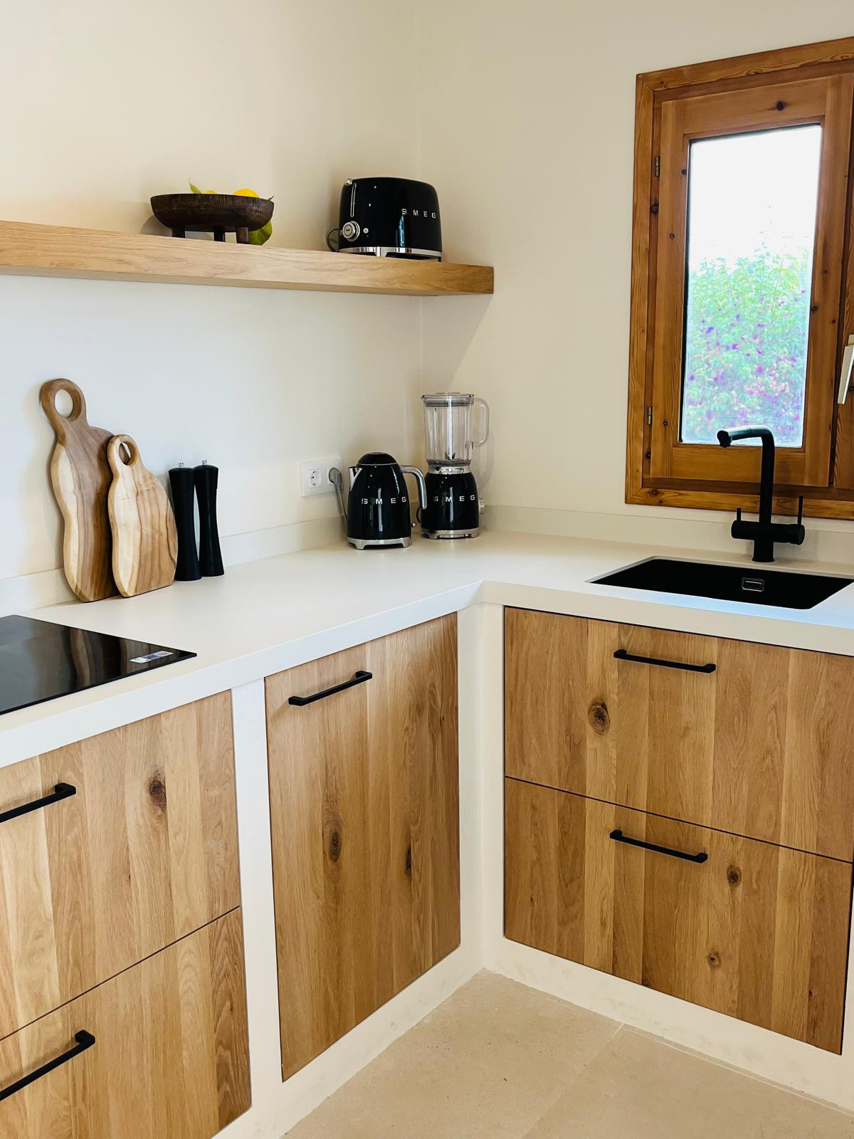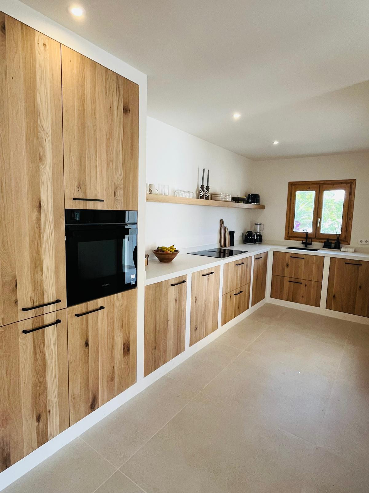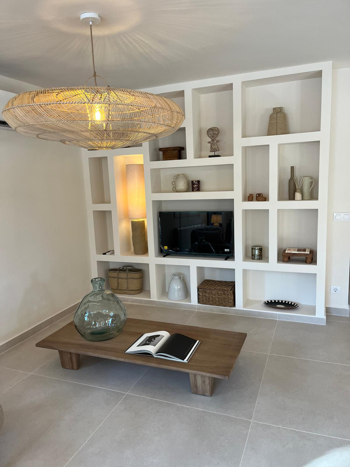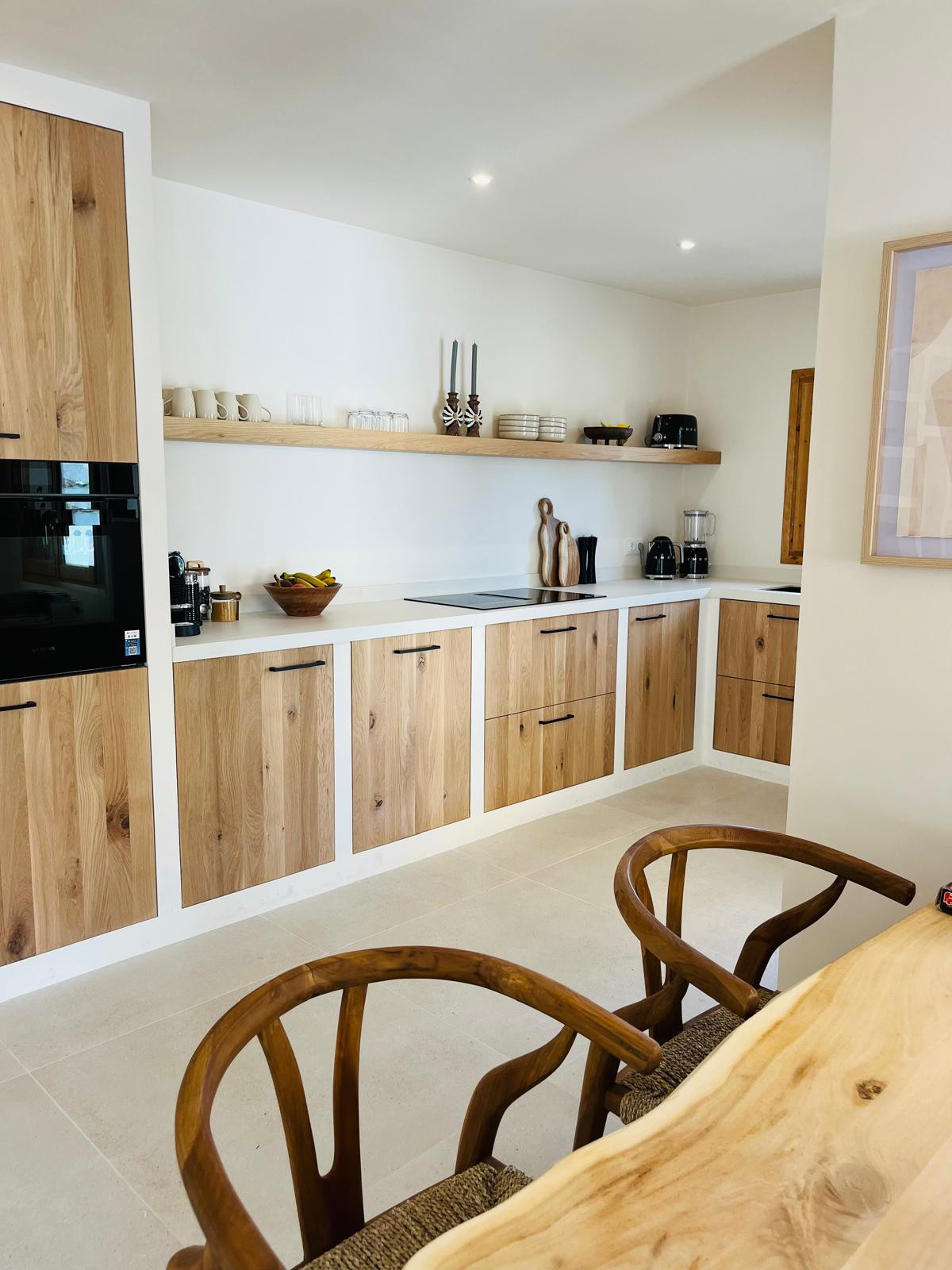 Binnen vind je een lichte, open leefruimte met houtaccenten, dat perfect aansluit bij de Spaanse charme. Er is een woonkamer met comfortabele zithoek en een gezellige eethoek, ideaal om samen te ontspannen.