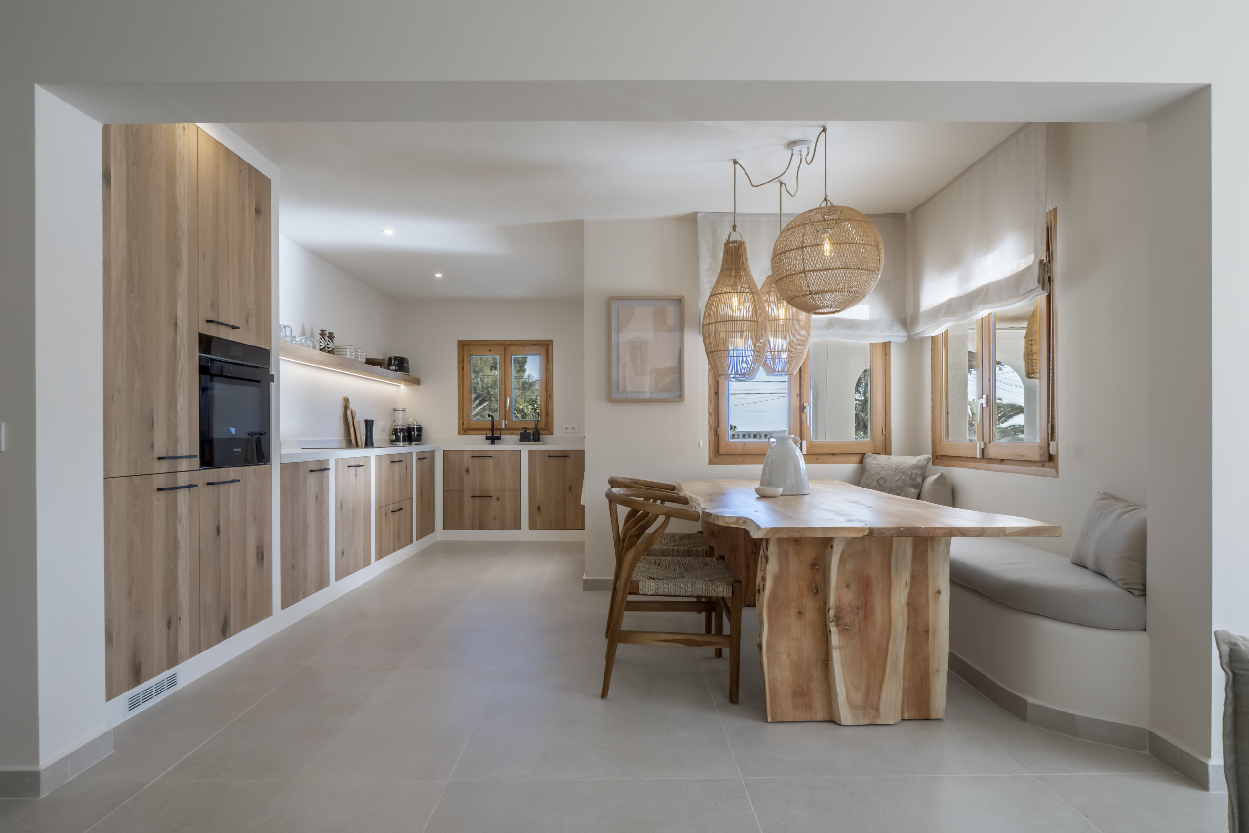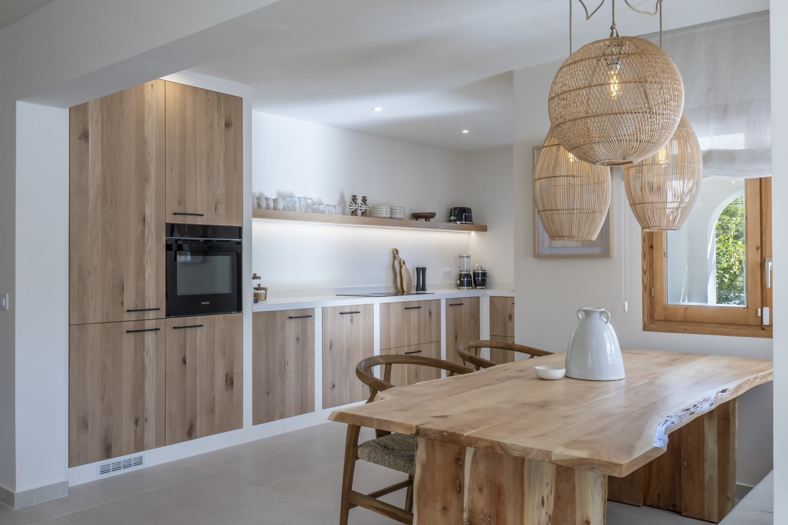 De moderne en gezellige woonkeuken is strak afgewerkt en van alle gemakken voorzien zoals een Siemens afwasmachine, grote koelkast, vriezer, combi- oven, Nespresso koffiezetapparaat en een 4-pits inductie kookplaat. Ook is er gefilterd kraanwater en staan er diverse apparaten- zoals broodrooster, smoothiemaker- van het merk SMEG. De eetruimte nodigt uit tot een uitgebreid ontbijt of een heerlijk diner. Grote ramen brengen het buitenlicht naar binnen en creëren een gevoel van rust en ruimte.
