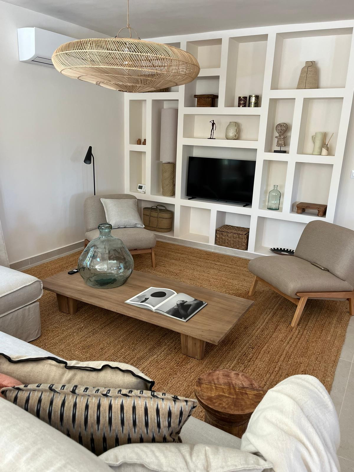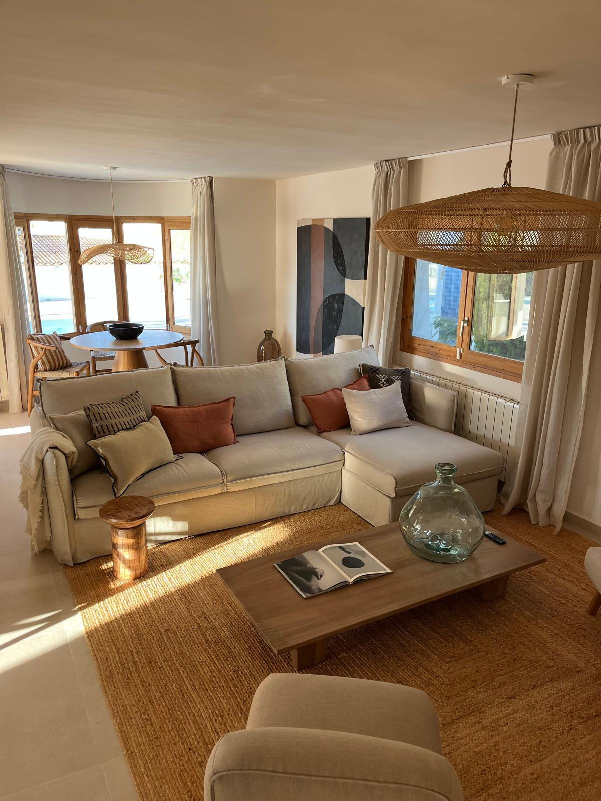 Binnen vind je een lichte, open leefruimte met houtaccenten, dat perfect aansluit bij de Spaanse charme. Er is een woonkamer met comfortabele zithoek en een gezellige eethoek, ideaal om samen te ontspannen.