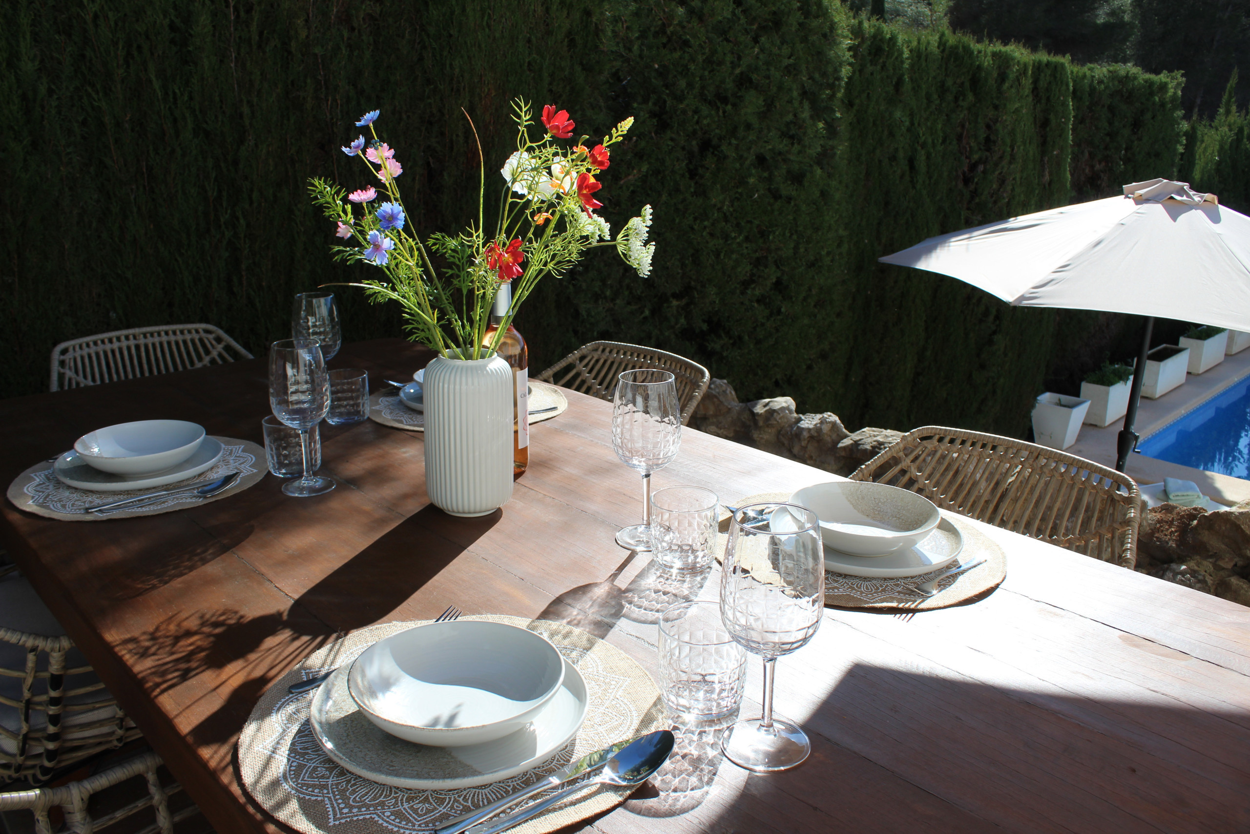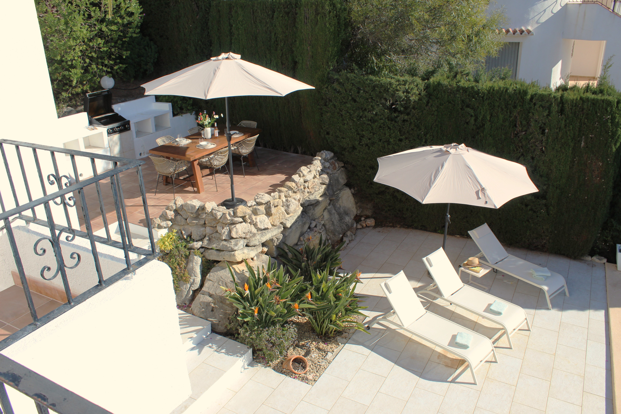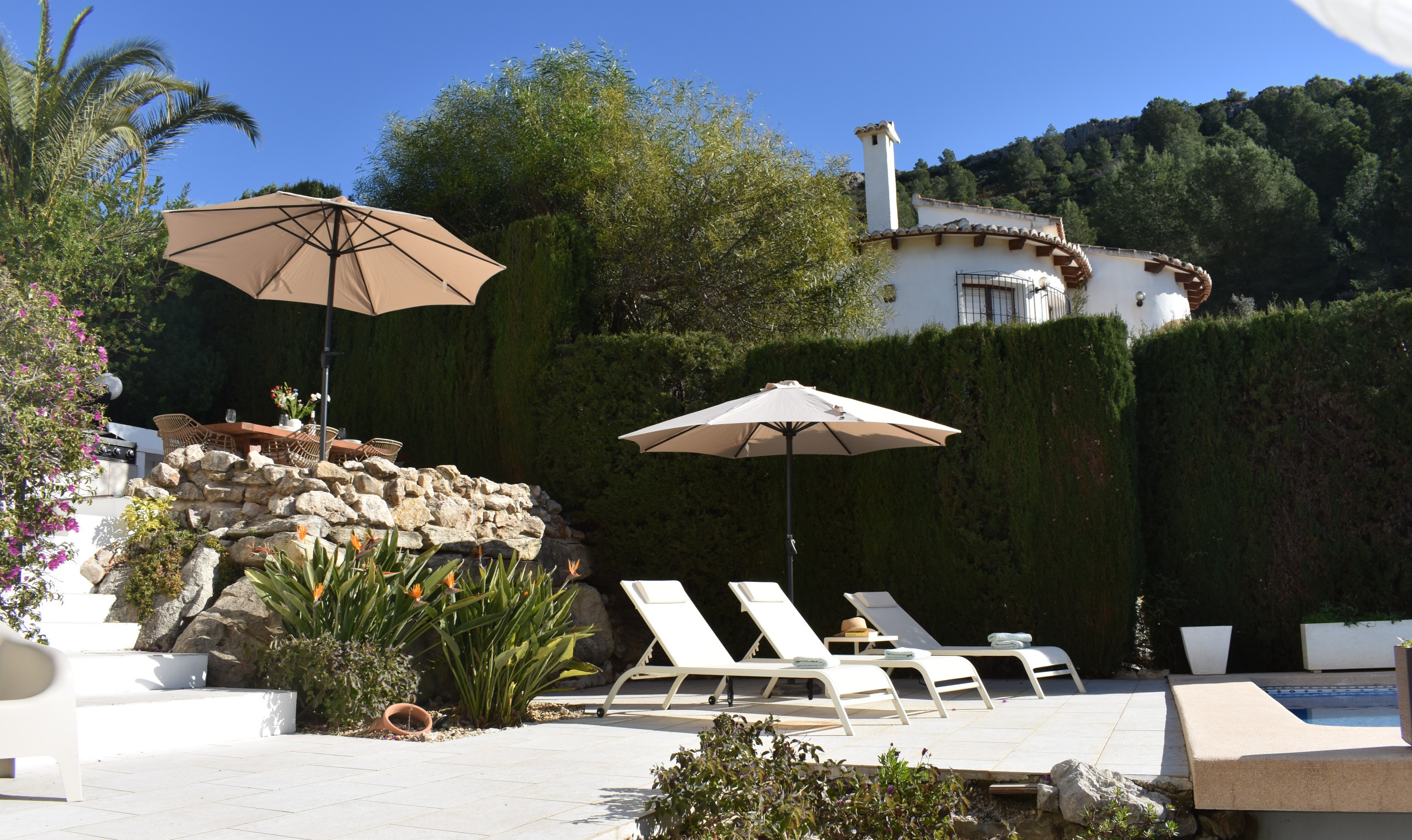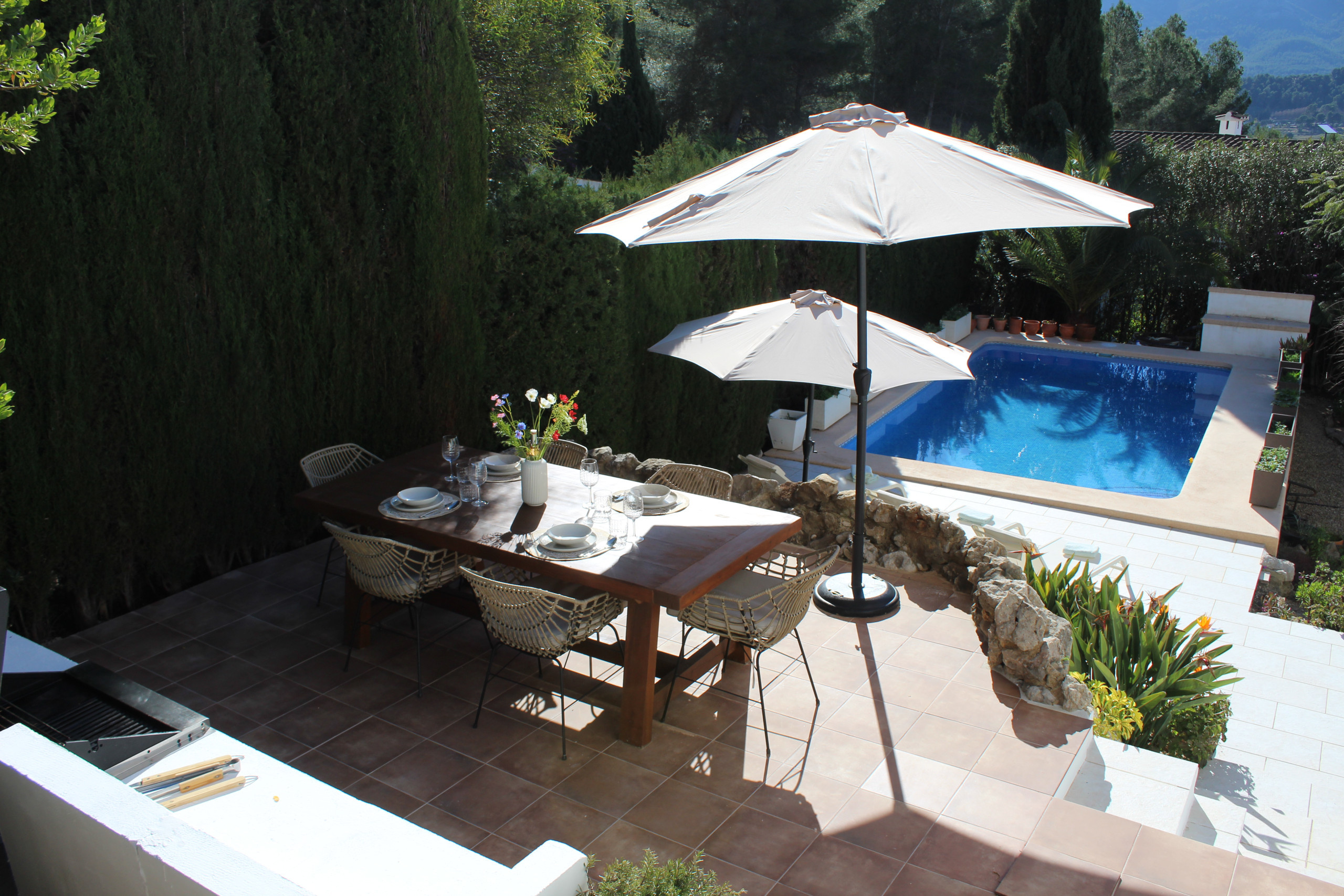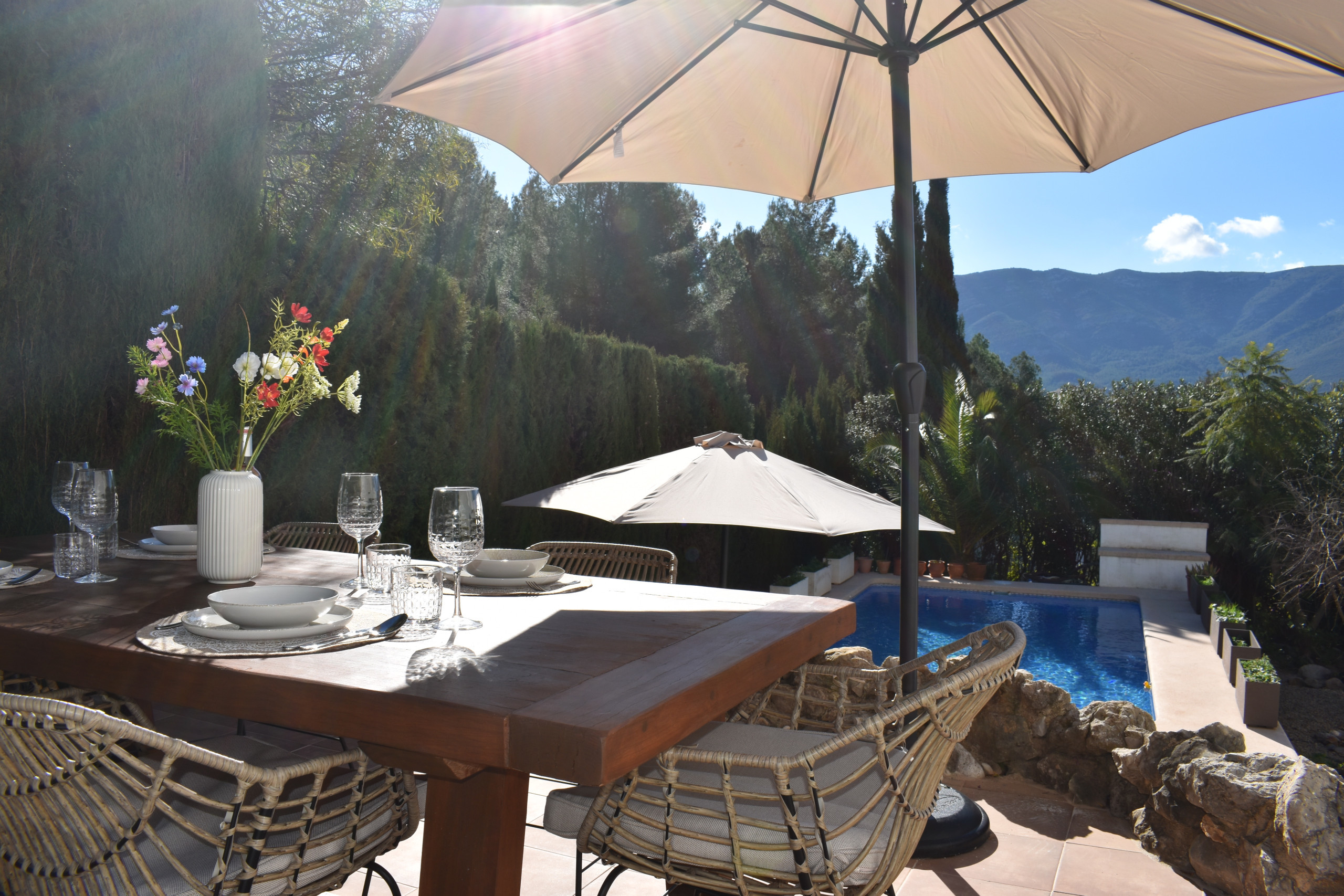 Vanaf de naja loop je via een korte trap naar het terras met BBQ en het fijne privé zwembad. Het terras is voorzien van een grote eettafel met 6 stoelen, parasol en een buitenkeuken met BBQ op gas. Je hebt hier zowel uitzicht op het zwembad als op de bergen. Een heerlijke plek om uren gezellig te dineren.